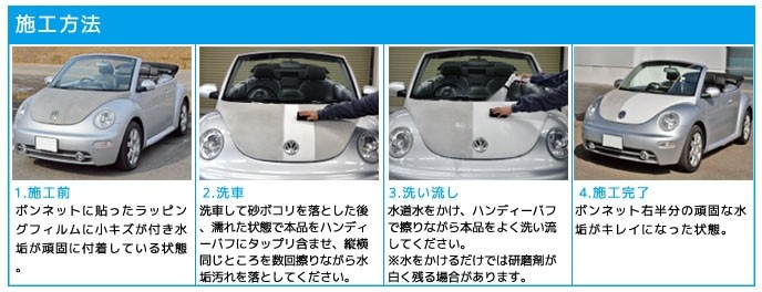 2.洗車 洗車して砂ボコリを落とした後、濡れた状態で本品をハンディーバフにタップリ含ませ、縦横同じところを数回擦りながら水垢汚れを落としてください。 |