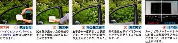 納車時の窓清掃用に購入しました。 ムラなく拭き取り出来るので作業時間が非常に少なく済みます。 ガラスに輝きが出るので、お客様に大変喜ばれています。 お店のモニターにも使用したところ、お客様より「小分けで販売して欲しい」とのお声も頂き、液晶テレビの画面掃除に使って、大変喜ばれていました。 「ふき取りが楽なだけでなく、汚れにくくなった」との事です。