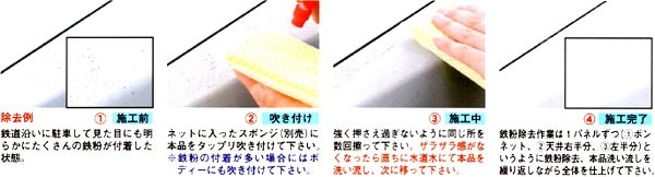 4.施工完了 鉄粉除去作業は1パネルずつ(①ボンネット、②天井、左半分)というように鉄粉除去、本品洗い流しを繰り返しながら全体を仕上げて下さい。 ※本品がガラス面・メッキ・ホイール部分に付着した場合は絶対に放置せず、直ちに水道水でしっかり洗い流して下さい。 |
